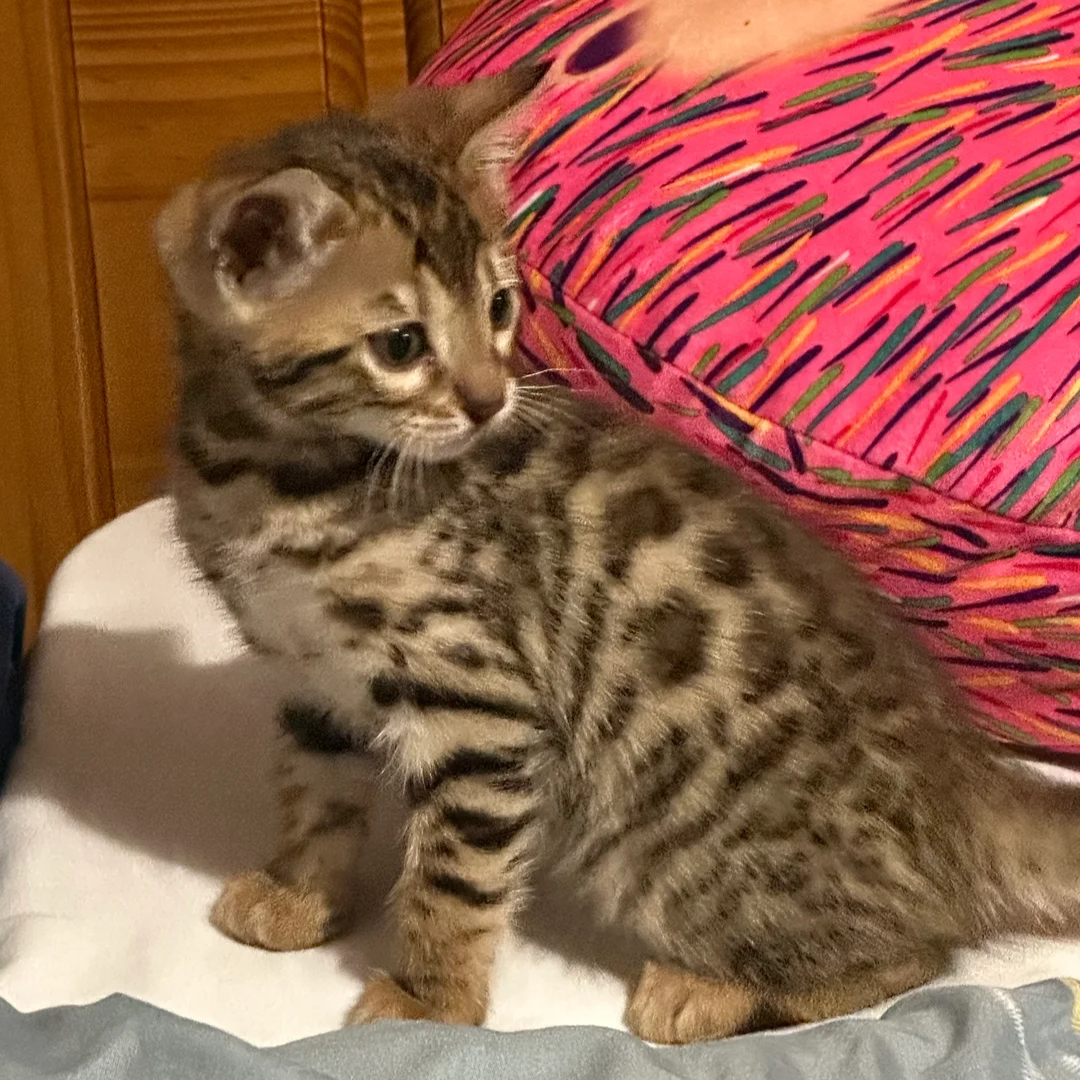 This is the first litter of pure breed bengals both family pets they have beautiful markings there are 3 spotted 1 marble and 1 black spotted and 1 black marble bengals they are using the litter tray and eating and drinking now they are absolutely stunning little kittens.